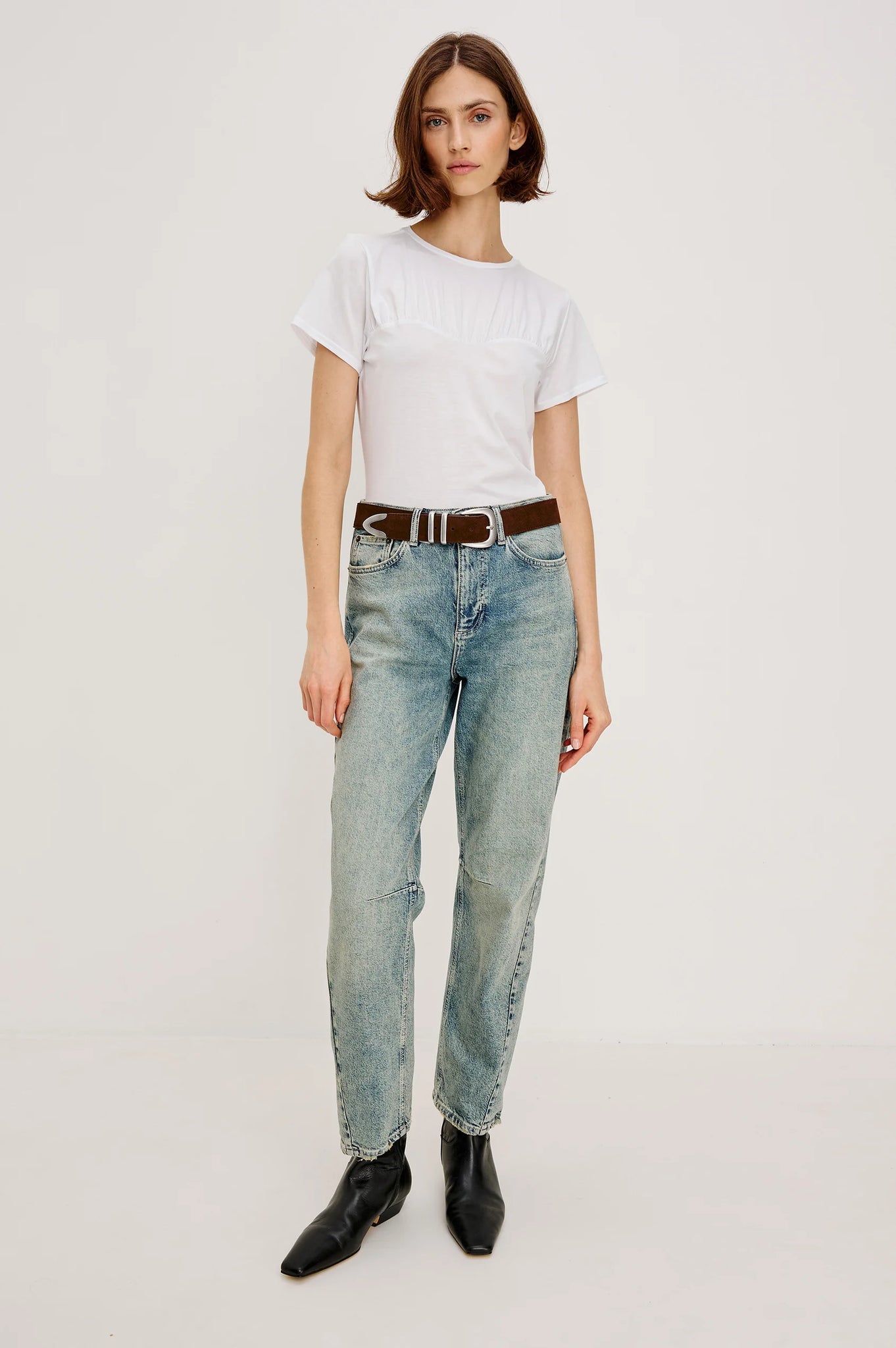 The Janis is a 100% cotton t-shirt with a sweetheart neckline and shirred detailing.  It features a classic fit for easy styling.