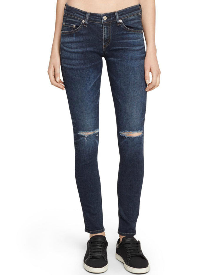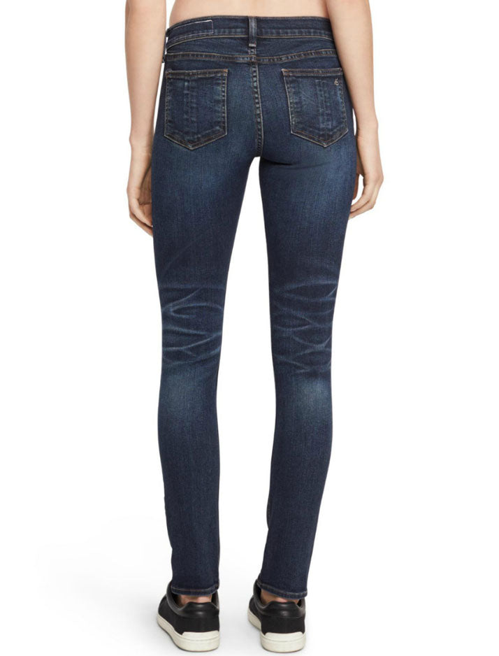 These mid-rise skinny fit jeans feature an 8" rise, vintage-inspired dark wash and knee holes. The perfect basic denim for every wardrobe.