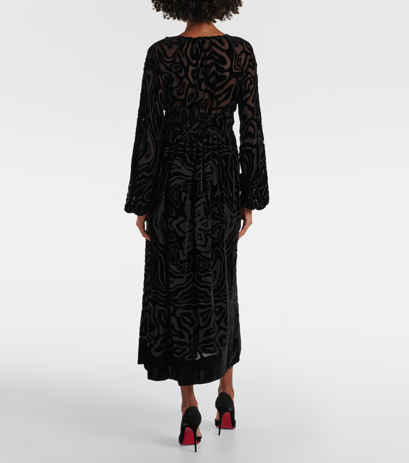 The Elora Dress is an intricately detailed dress made from black burnout velvet with a botanical motif at the center, surrounded by swirling animal-like patterns.  This exquisite beauty has a V-neckline with voluminous long sleeves, an elastic waist for comfort, and unfurls to a midi-length hem.  It pulls over and is lined in the bodice and skirt.