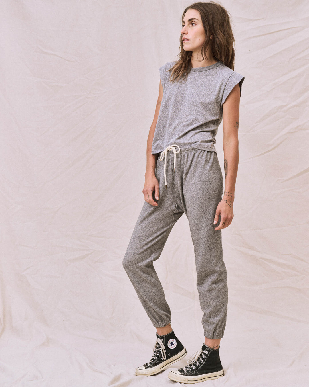 The Peak Shoulder Tee. Heather Grey