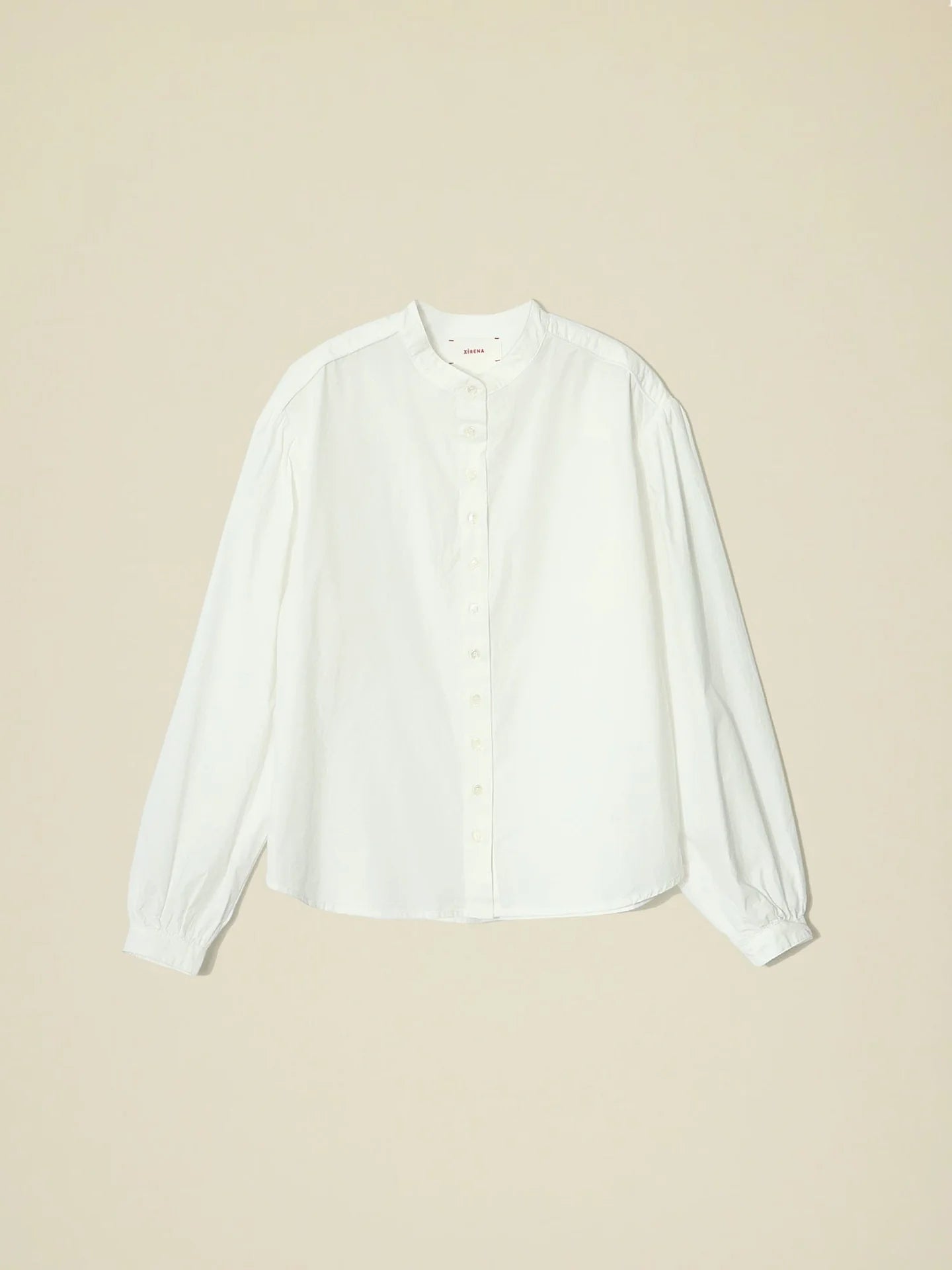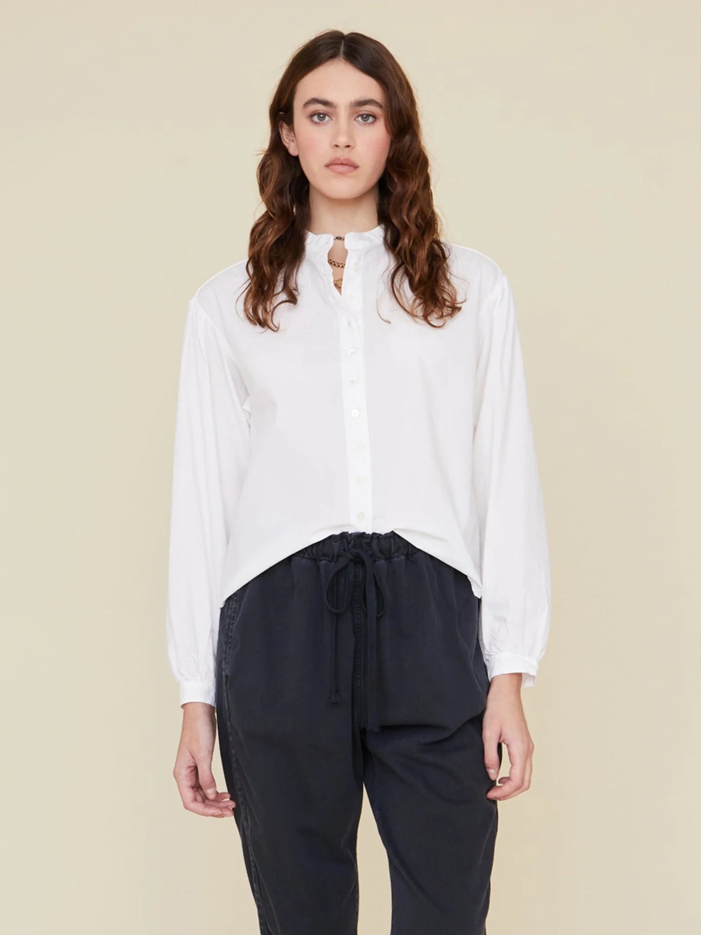 It's all in the details. Connolly is made in a smooth and crisp cotton poplin. Connolly is a button-front shirt with a band collar, piping at the shoulder, shirred blouson sleeves with a button cuff, and released box pleat at the back.